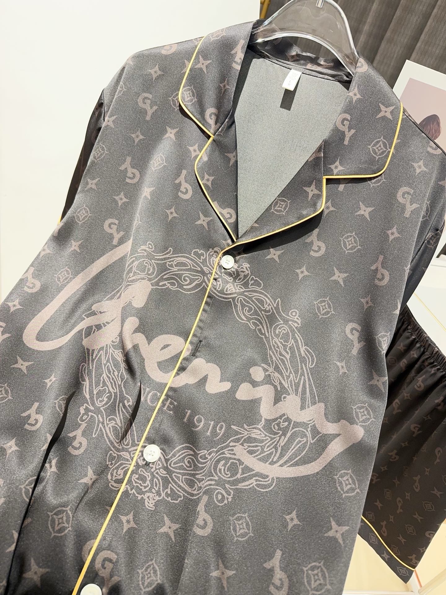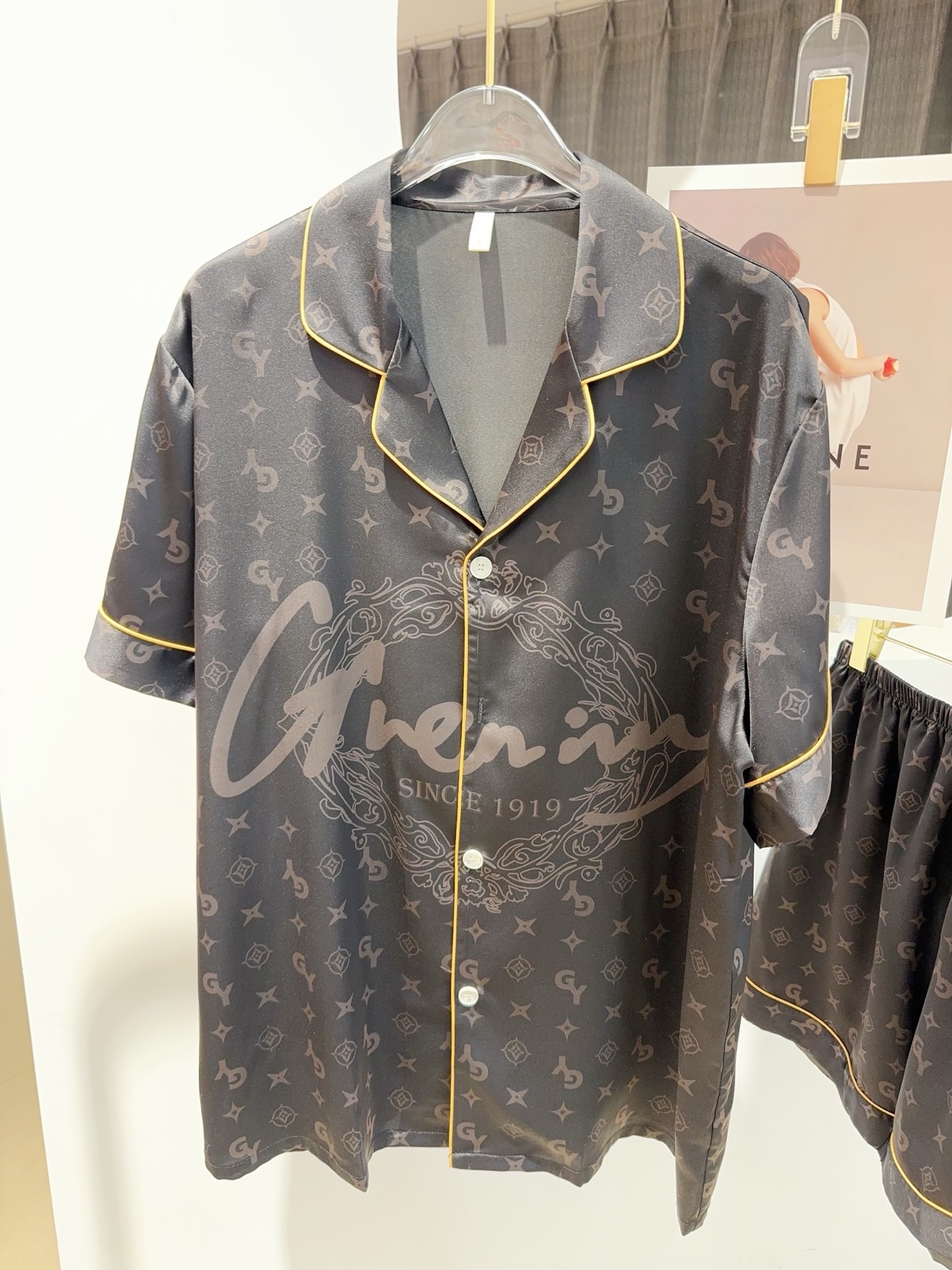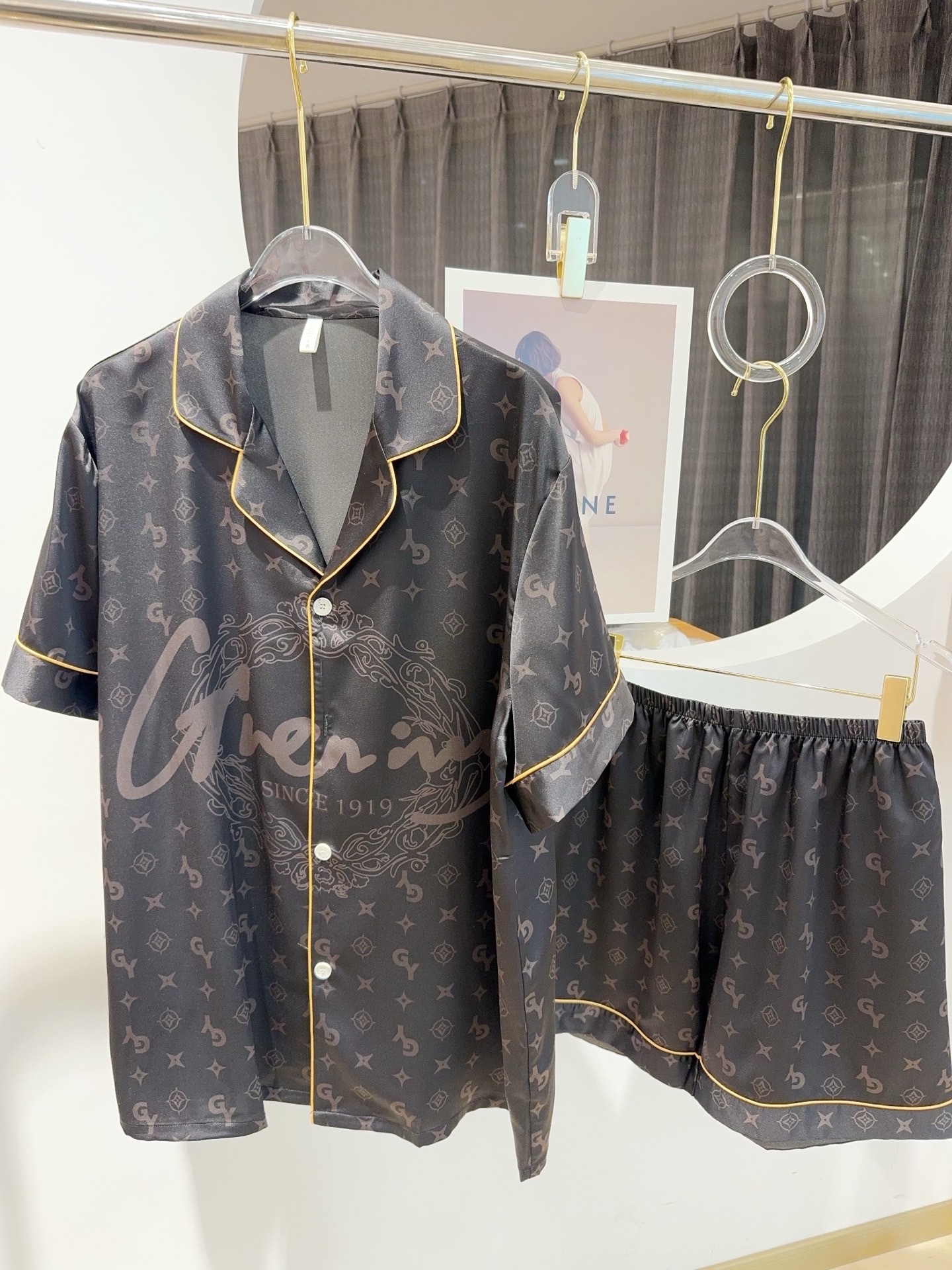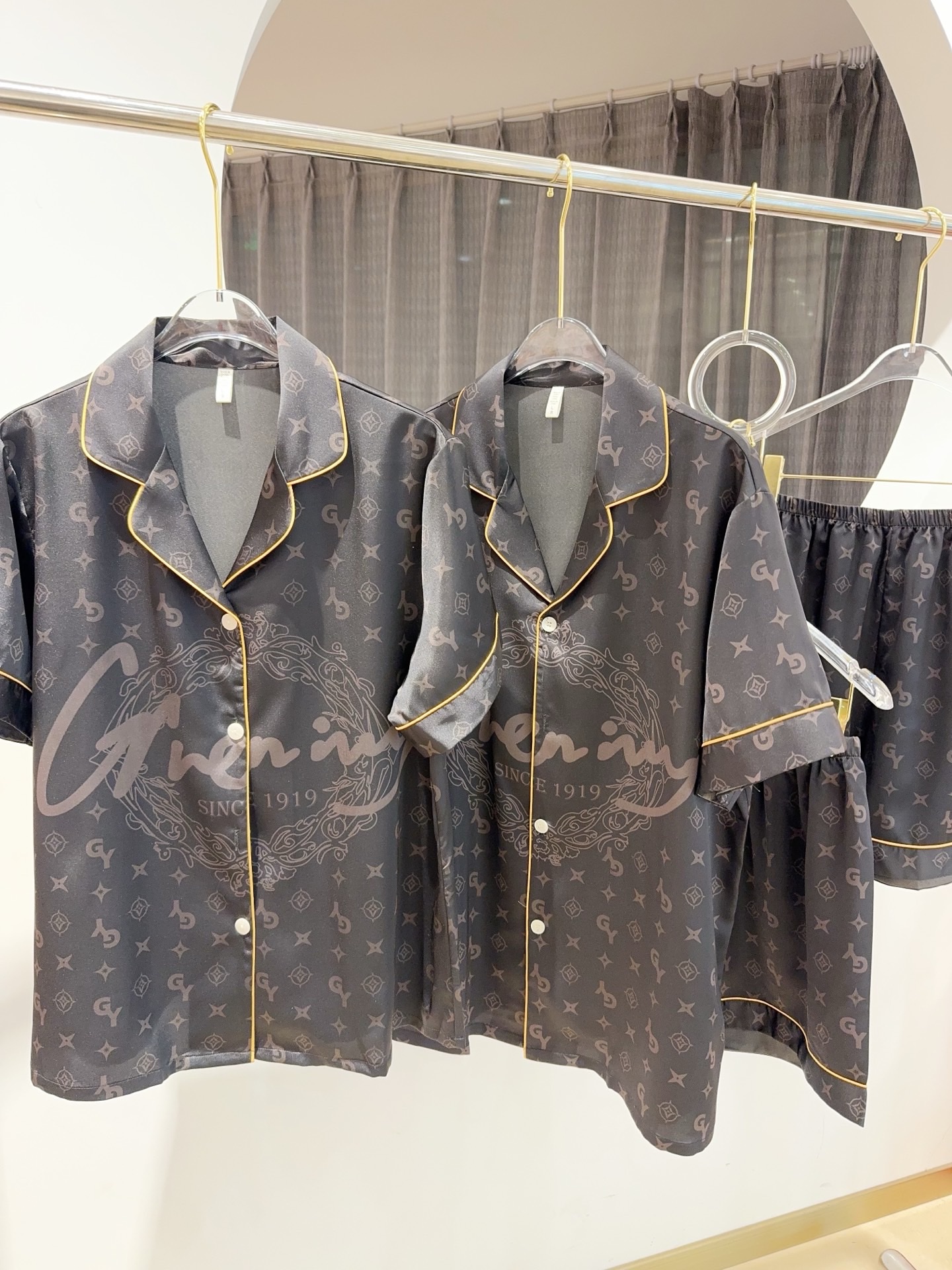 ✔️ Thiết kế: Bộ đôi pyjama nam – nữ tay ngắn quần short, họa tiết logo G nổi bật, đường viền vàng sang trọng.