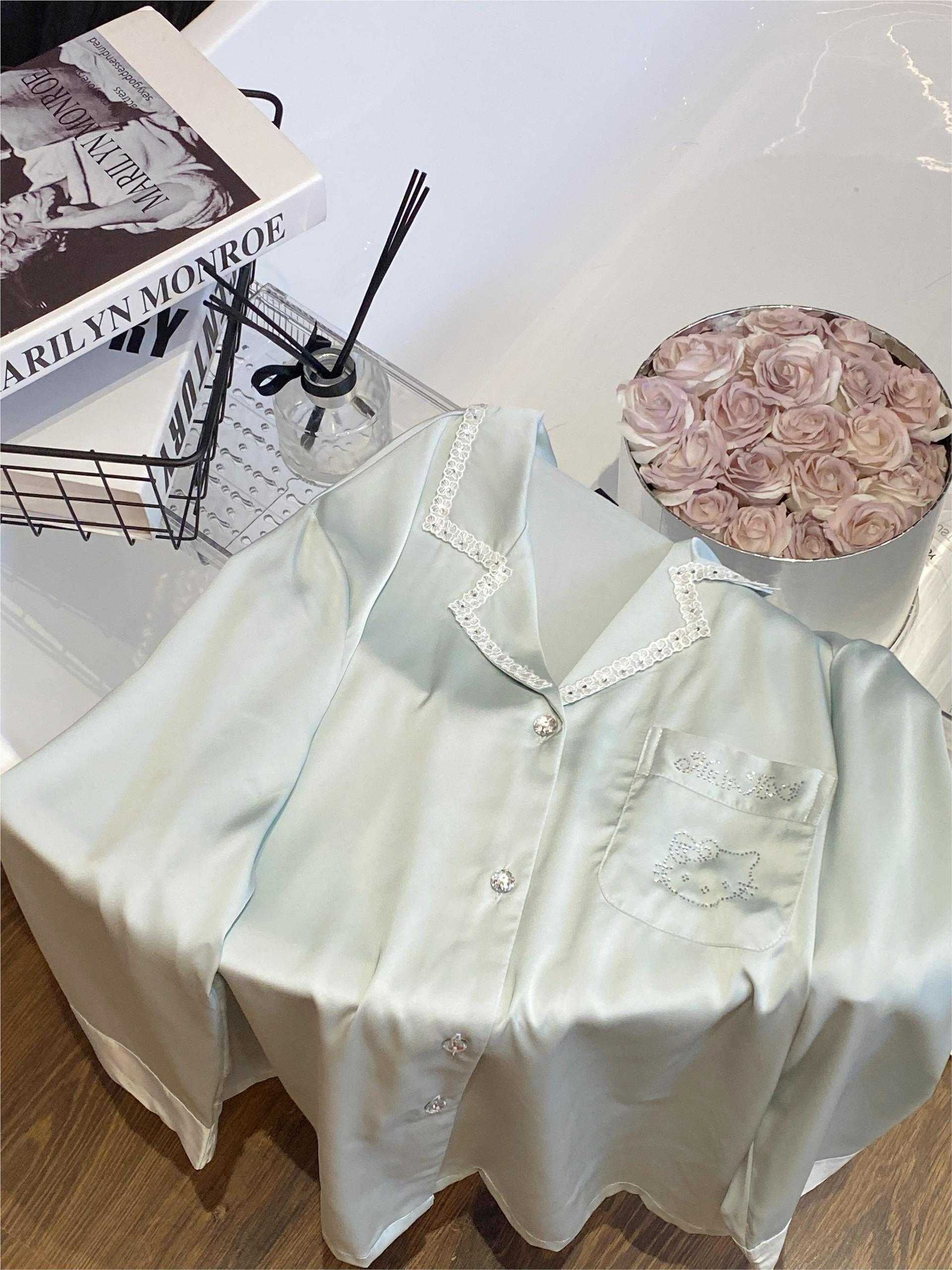 Màu sắc : bộ ngủ lụa pijama màu trơn xanh nhạt , xanh mint viền ren hoa ngay cổ áo đính cườm hello kity ngay túi áo style dễ thương nhẹ nhàng sang trọng.