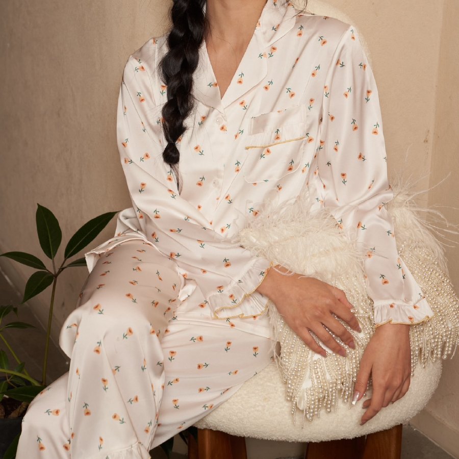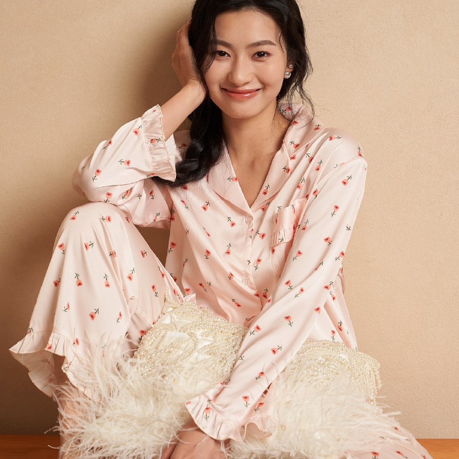 Đồ bộ ngủ nữ Pyjama lụa băng trơn Shury Store tay dài quần dài mặc nhà , mặc ngủ TD81 trên nền lụa băng trơn màu trắng , hồng in hoa hồng nhỏ viền bèo ngay ống tay và ống quần tạo nên bộ trang phục ngủ dễ thương cho người mặc