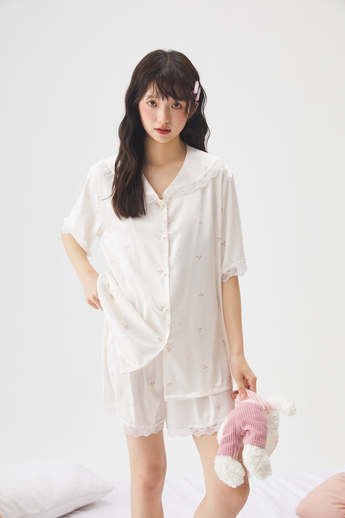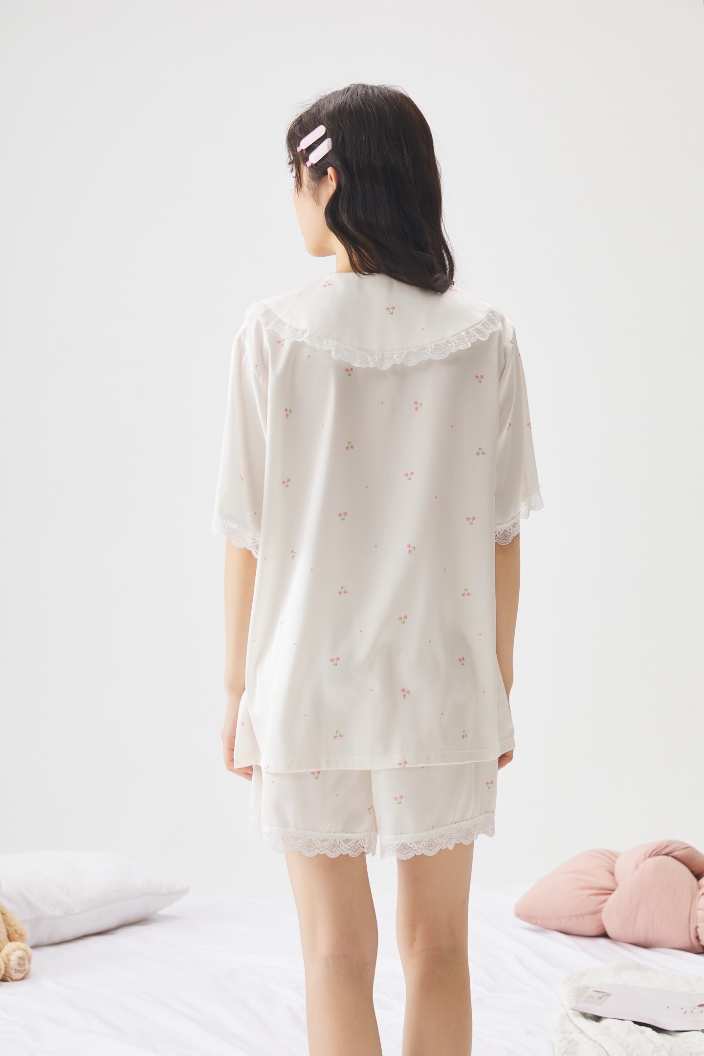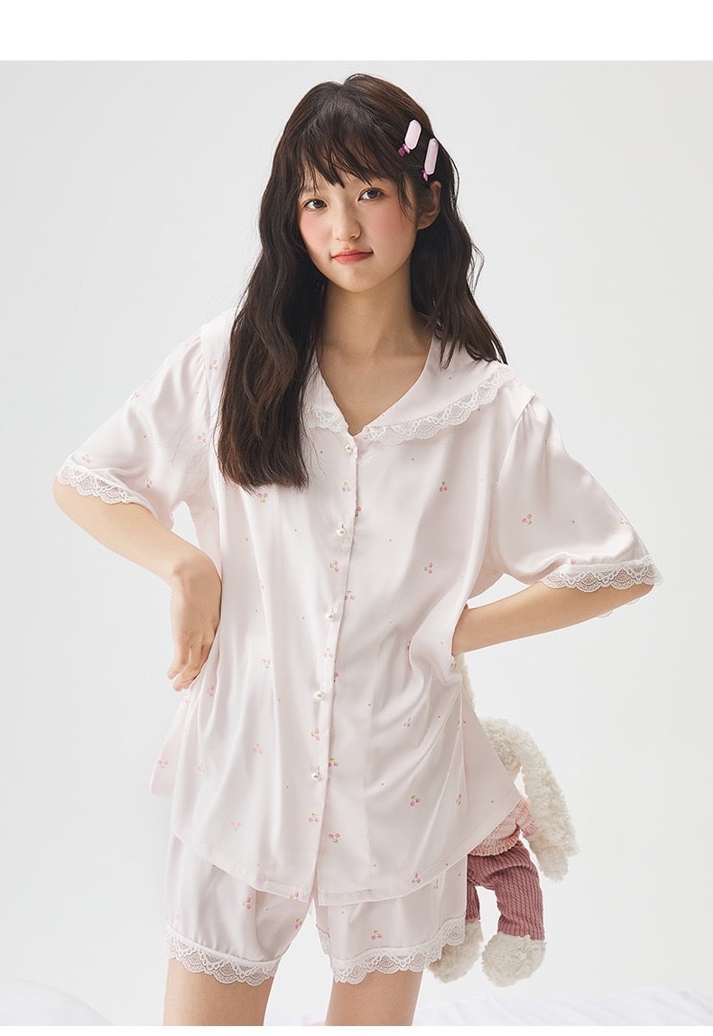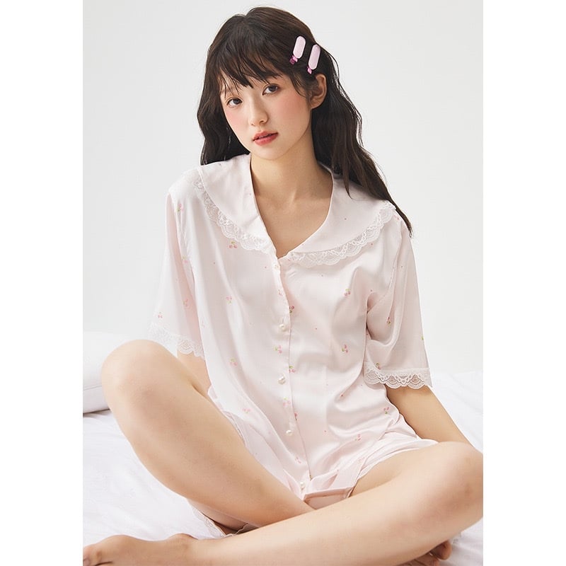 🍒 Bộ Pyjama lụa ngắn cổ sen phối ren – Mã NT20 | Shury Store Home Wear