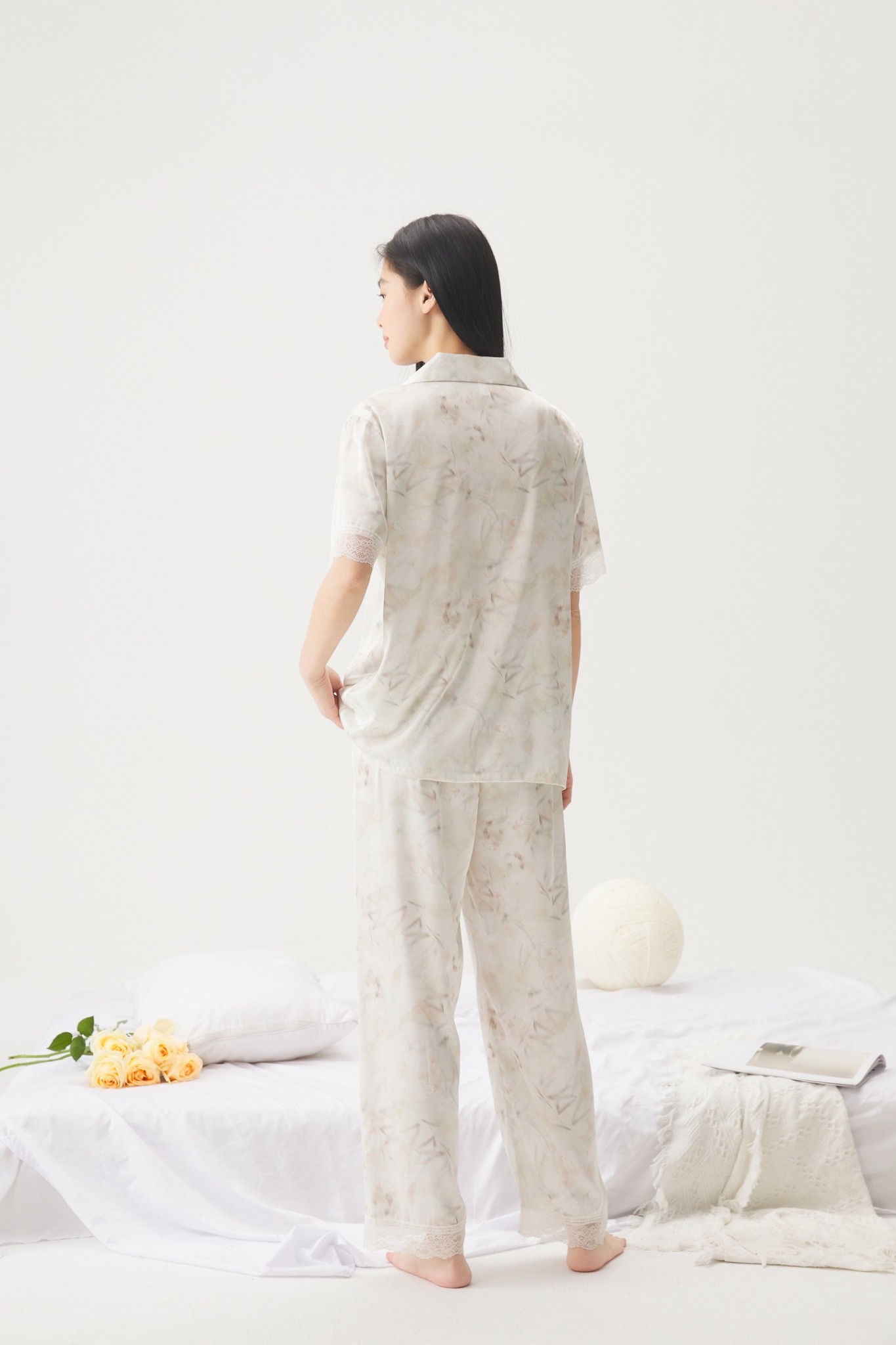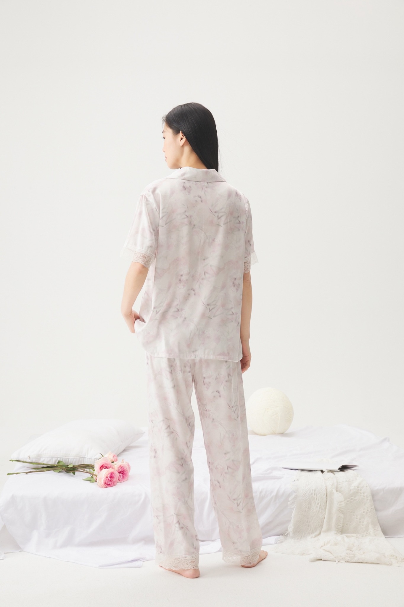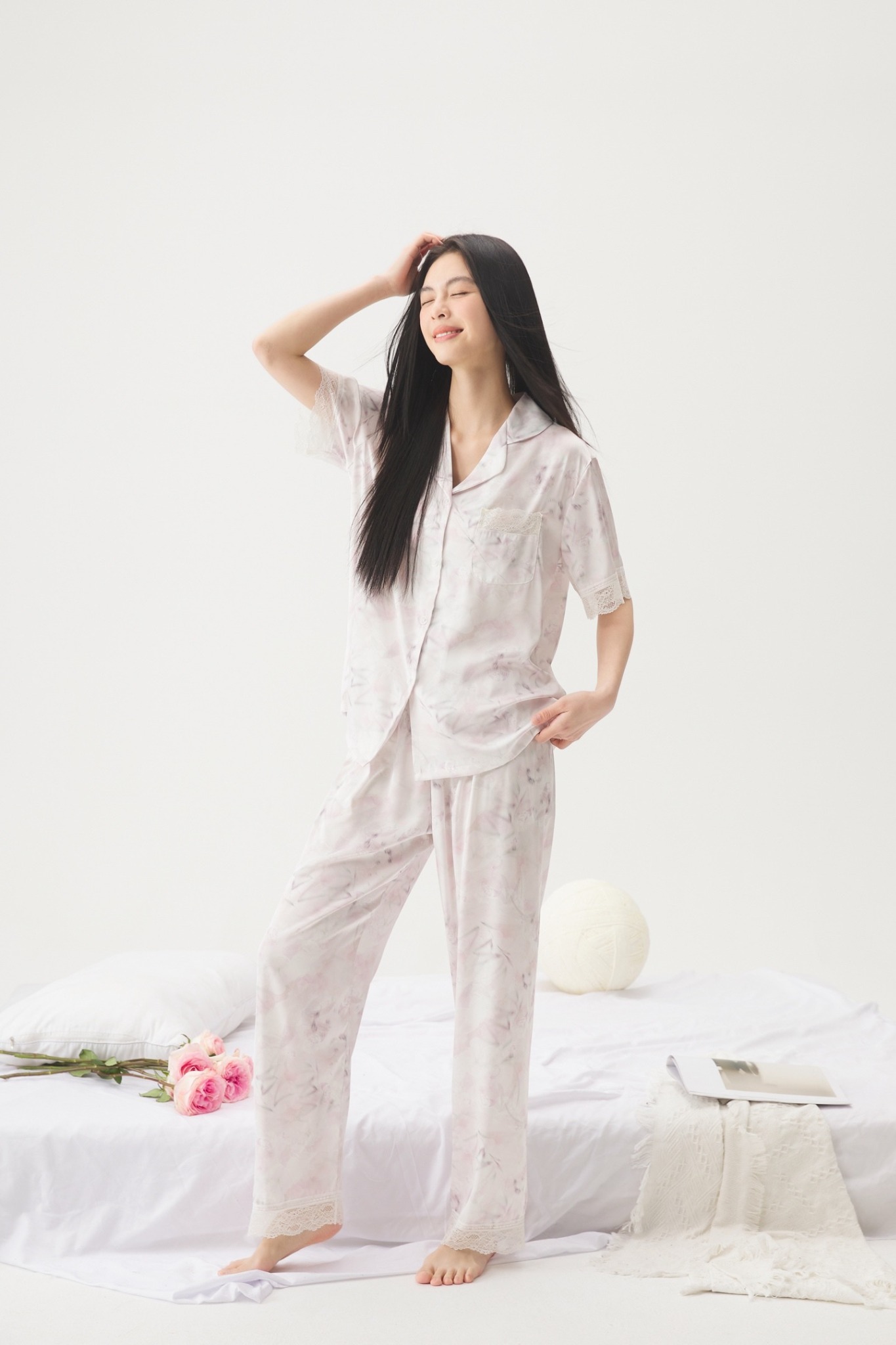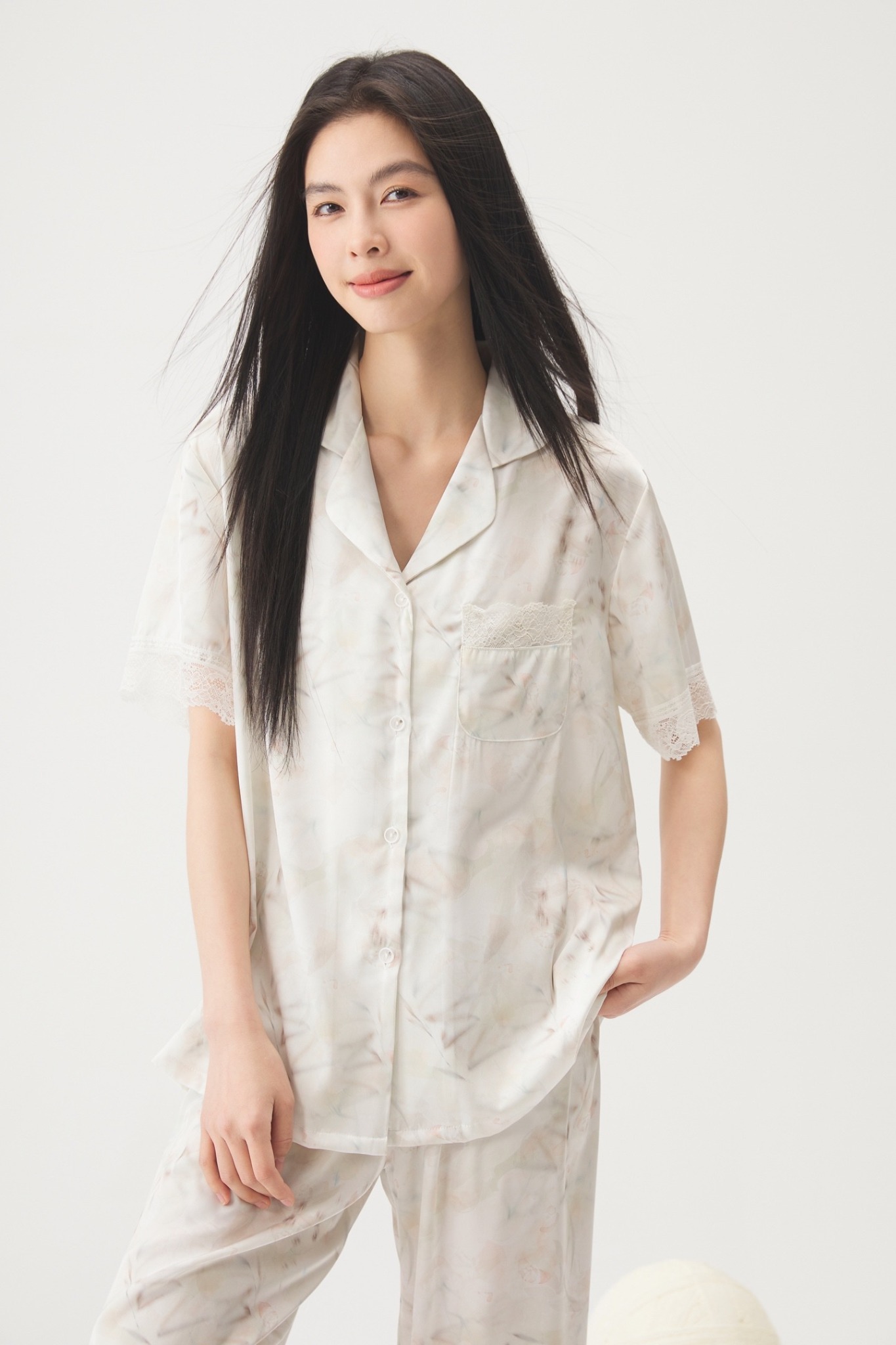 Chất lụa cao cấp in họa tiết pastel nhã nhặn kết hợp chi tiết ren bo tay và ống quần tạo nên nét thanh lịch xen lẫn sự quyến rũ dịu dàng.