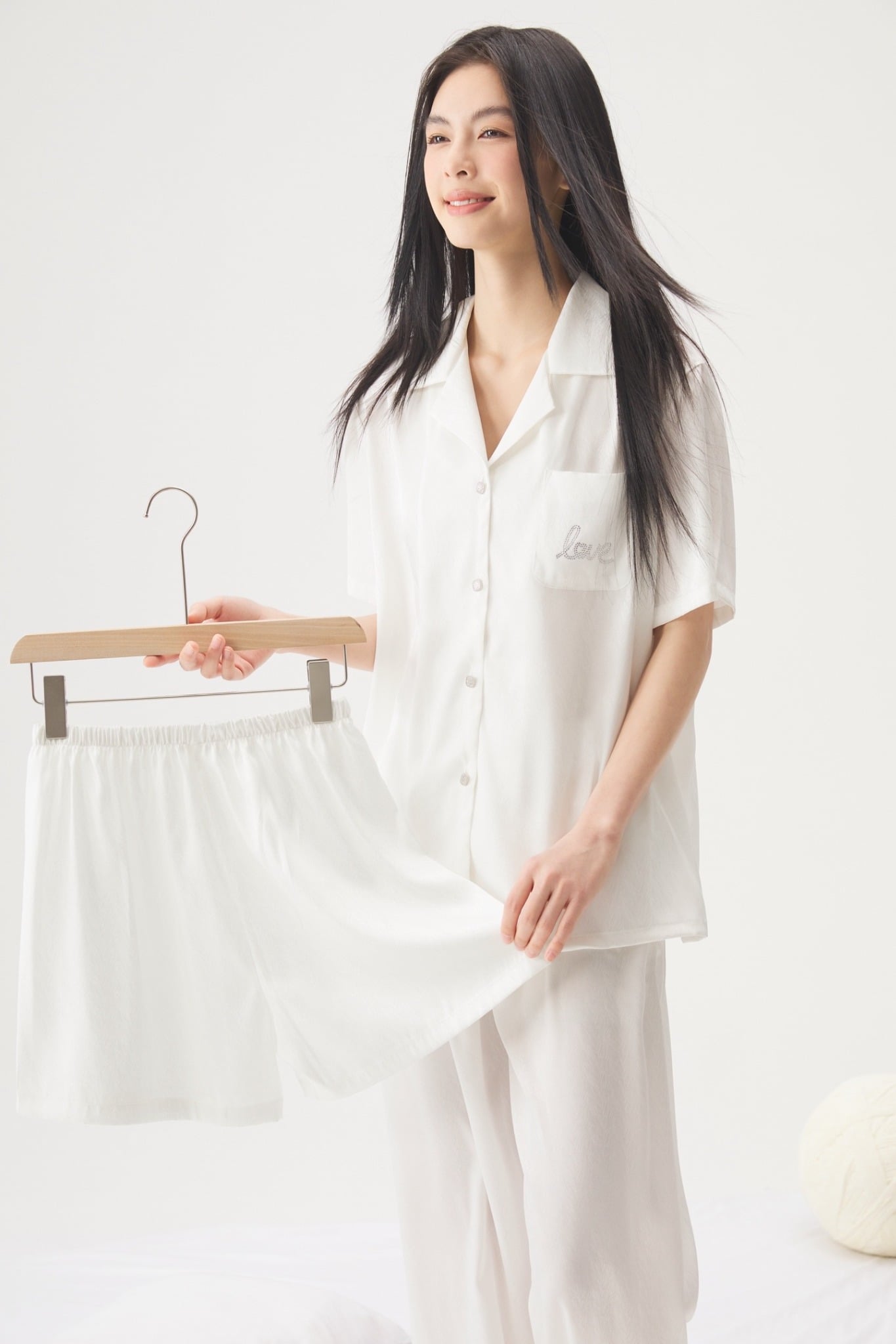 Chi tiết tinh tế: Túi ngực đính cườm chữ Love nhẹ nhàng, đường may tỉ mỉ bo viền đẹp mắt.