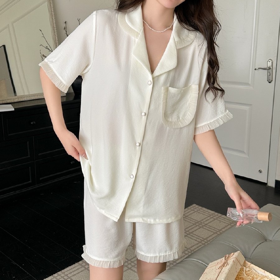 Đồ bộ ngủ Pyjama lụa băng tay ngắn quần ngắn NT06 trên nền lụa màu kem , hồng viền bèo tạo nên bộ trang phục đáng yêu cho người mặc