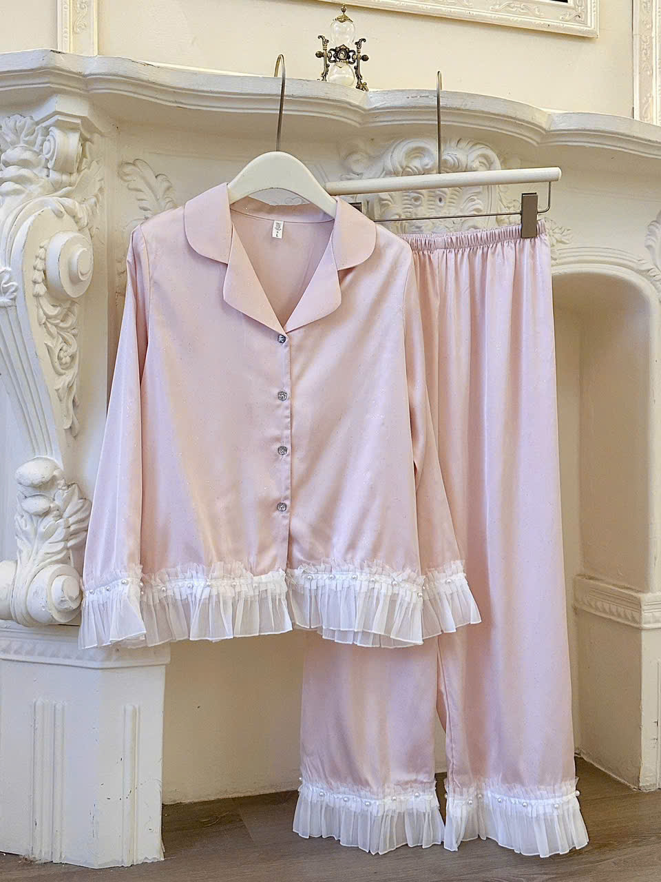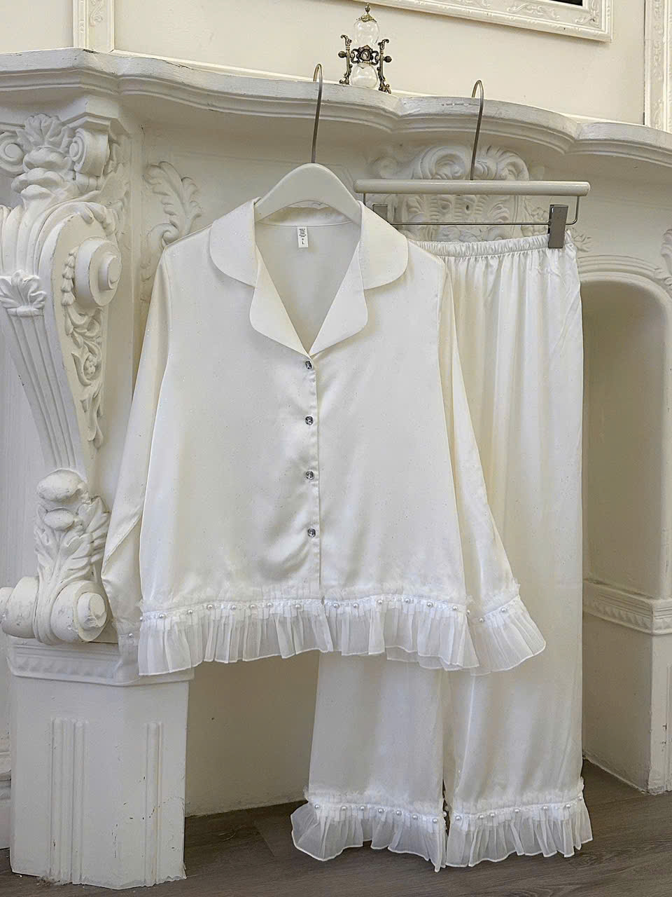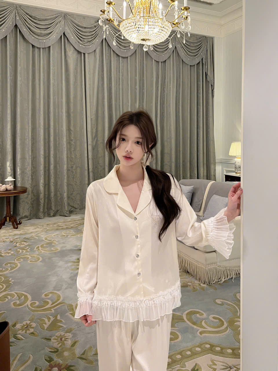 Bộ pyjama tay dài quần dài được thiết kế theo phong cách nữ tính – thanh lịch – sang trọng, phù hợp cho chị em yêu sự nhẹ nhàng nhưng vẫn muốn cảm giác cao cấp trong từng chi tiết khi mặc ở nhà hay lúc ngủ.