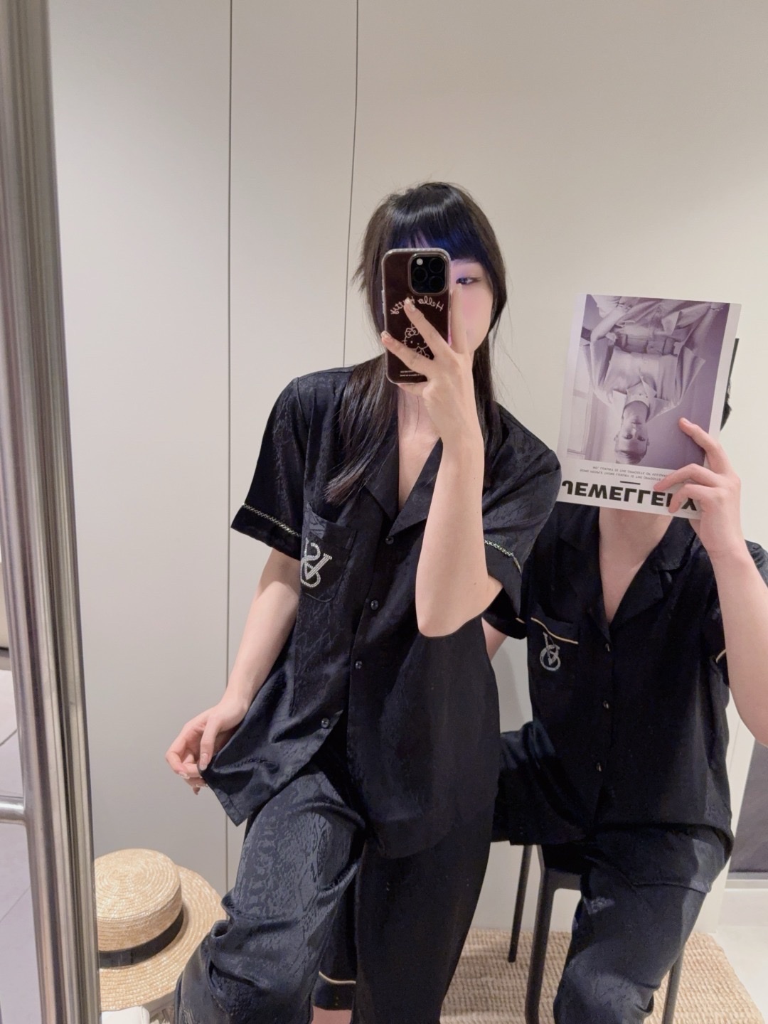 🌟 Họa tiết vân nổi sang trọng, tạo hiệu ứng bắt sáng nhẹ nhàng, phối thêm viền chỉ tương phản tinh tế ở tay áo và lai quần áo – nổi bật nhưng vẫn giữ sự thanh lịch.
