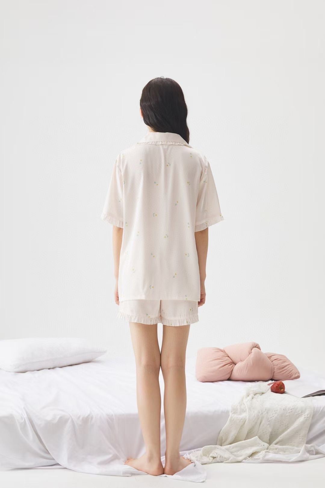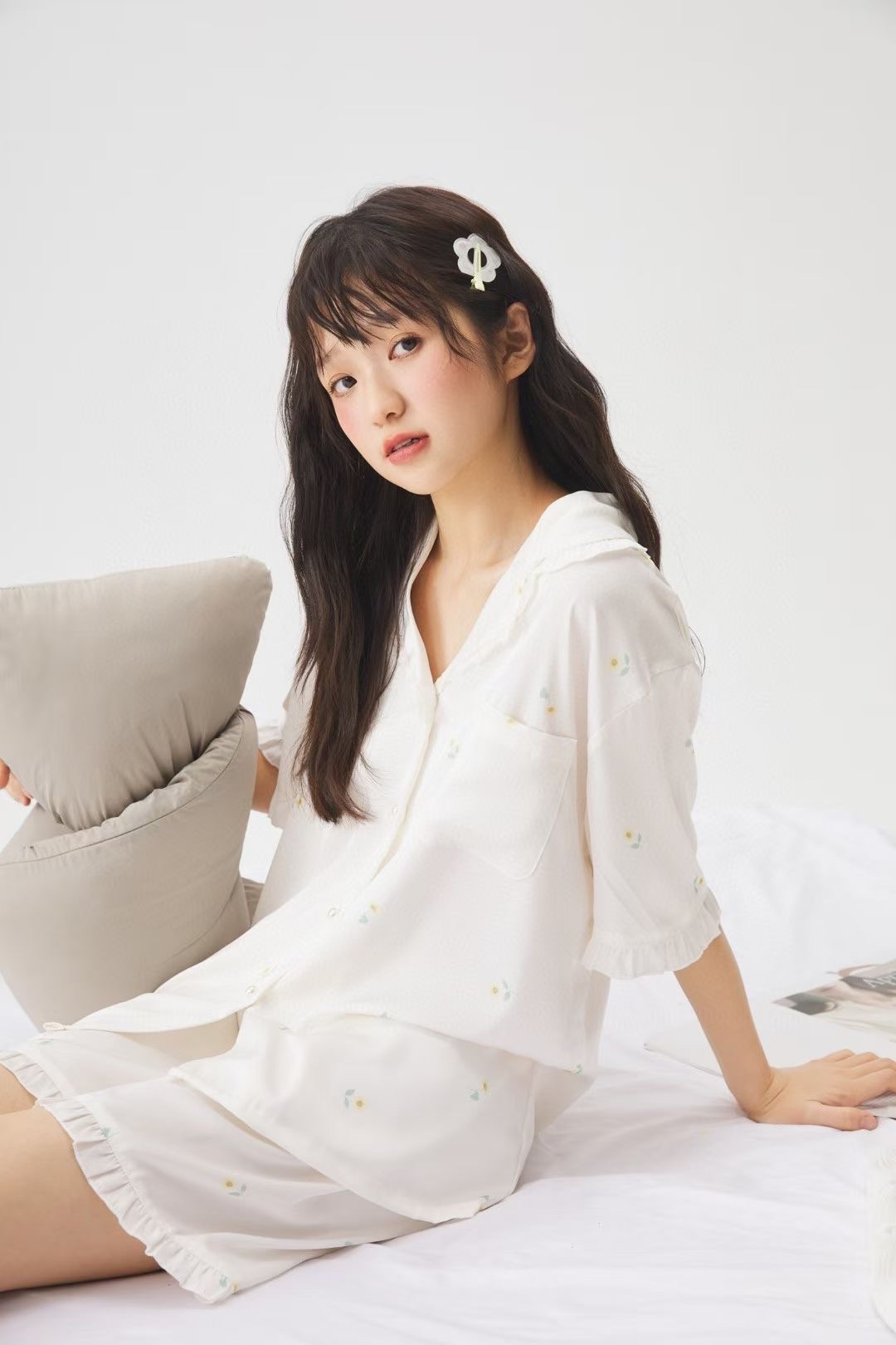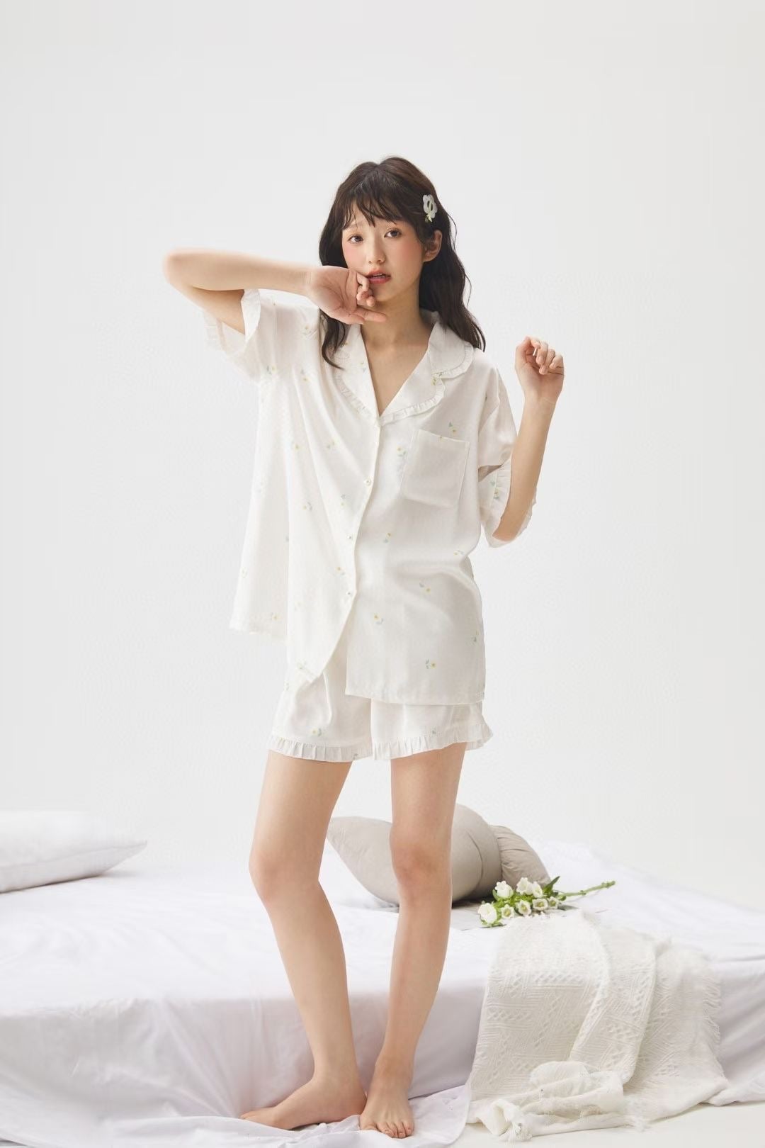 🌸 Mã sản phẩm: NT36 – Pyjama ngắn tay 2 màu kem & hồng hình bông hoa.